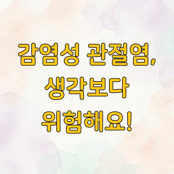 감염성 관절염은 빠른 치료가 매우 중요 해요. 자칫 잘못하면 관절 기능이 영구적으로 손상될 수 있기 때문에, 위와 같은 심한 증상이 나타나면 즉시 병원을 찾아 정확한 진단과 치료를 받아야 한답니다.